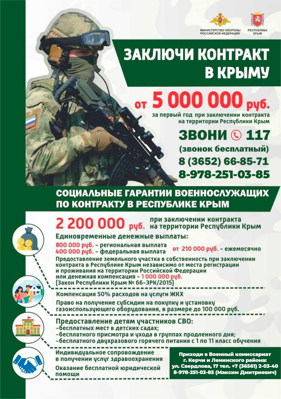 Нет ничего почётнее, чем быть защитником Родины. Подписывая контракт в Крыму, ты сразу получаешь два миллиона двести тысяч рублей, а за первый год службы – от пяти миллионов.