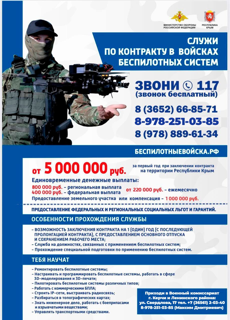 Также есть возможность освоить современную, востребованную и перспективную профессию - поступи в войска беспилотных систем, заключив контракт с Министерством обороны РФ.