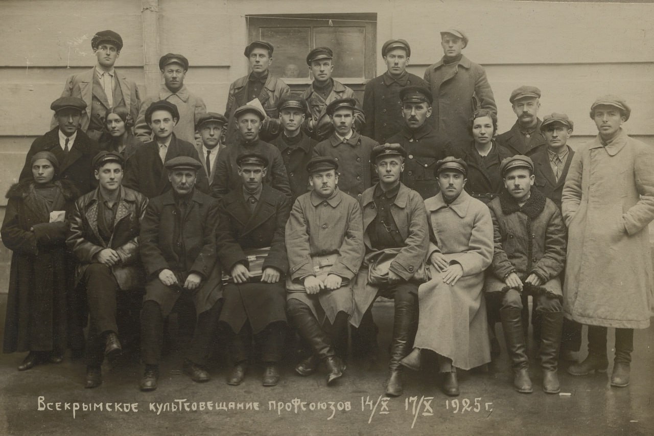 на первом – участники Всекрымского культсовещания профсоюзов (октябрь 1925 года) и любознательный мальчишка, который вовремя выглянул в окно и вписал себя в историю города;