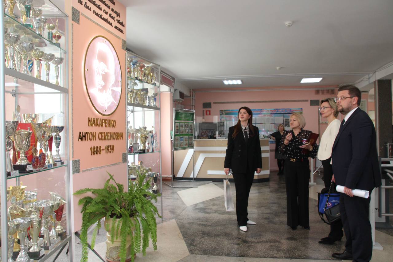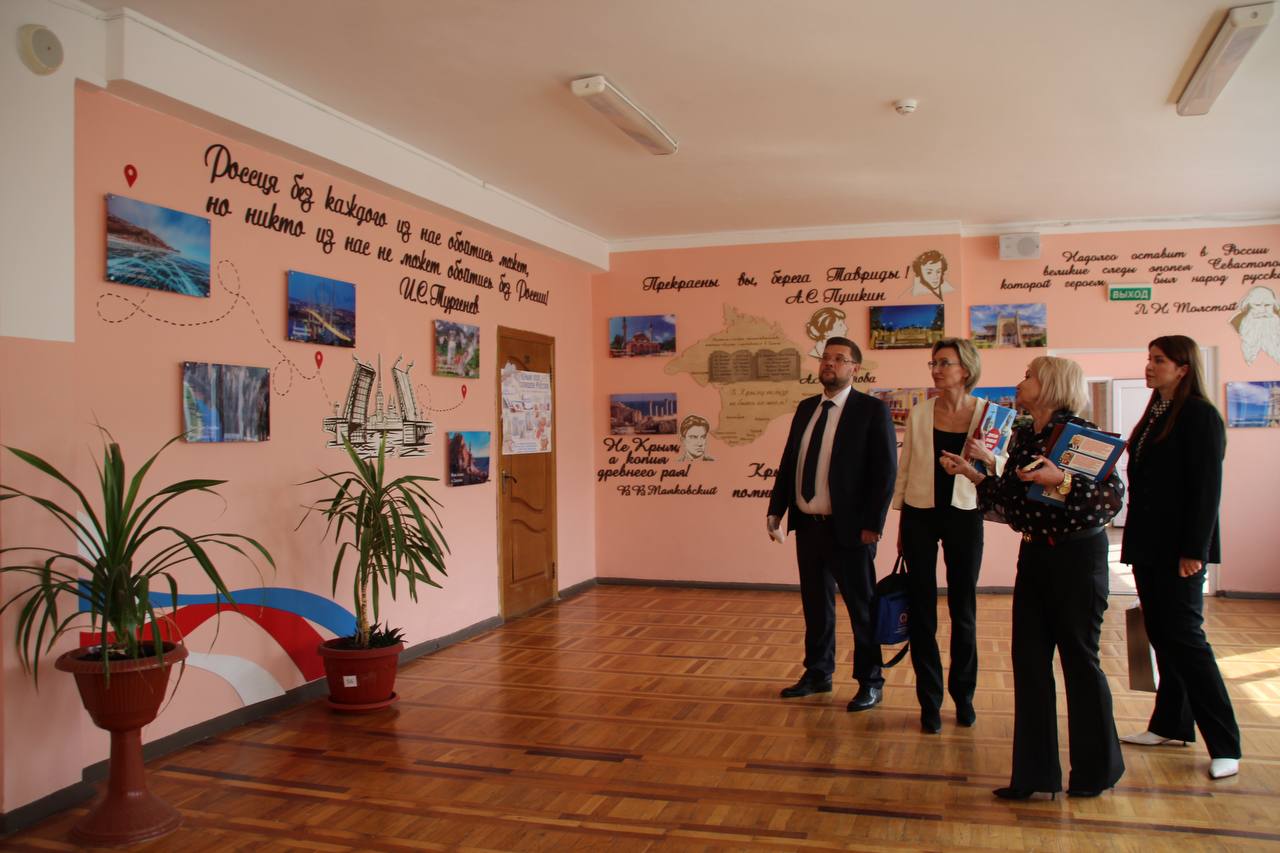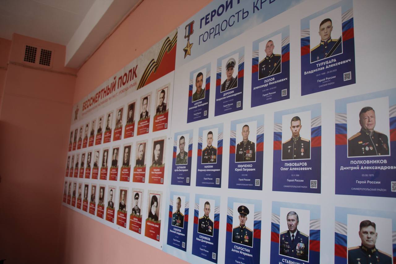 Гости также осмотрели школьные стенды с героями ВОВ и СВО, обновлённые цитаты о Крыме и Родине, деревянную карту России и выставку достижений учеников — от кубков до грамот.