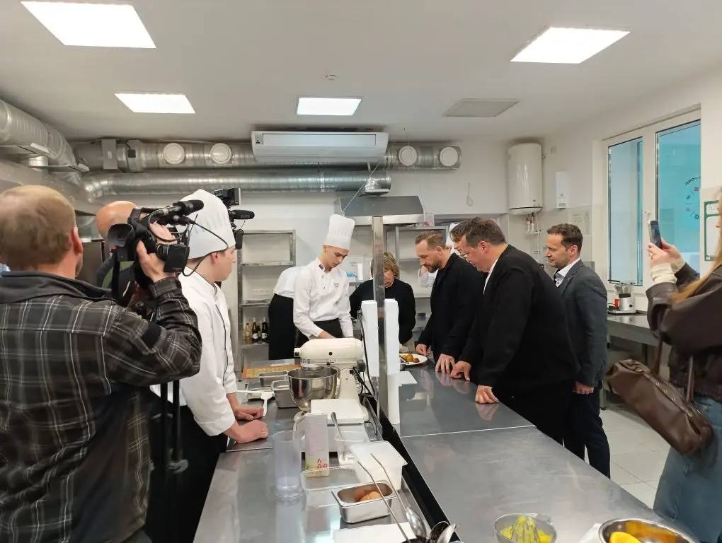 А в это же время наши сотрудники в Романовском колледже индустрии гостеприимства знакомили студентов со знаменитыми шеф-поварами - звездой телеканала «Пятница» Ильей Захаровым и основателем Премии «ПРОРЕСТ» Романом Лужным. Познакомили и с министром - Сергеем Александровичем.