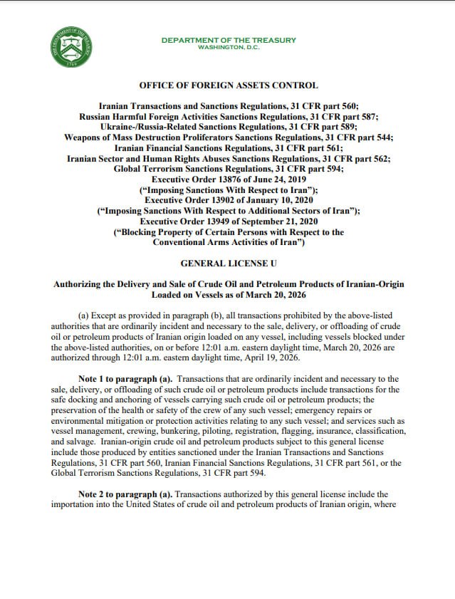 Документ разрешает экспорт и реализацию иранской сырой нефти и нефтепродуктов, которые были погружены на суда не позднее 00:01 по восточному времени 20 марта.