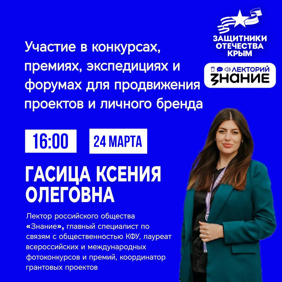 Для вас выступит Ксения Гасица – лектор Российского общества «Знание», главный специалист по связям с общественностью Крымского федерального университета (КФУ), лауреата российских и международных конкурсов и премий, координатора грантов.