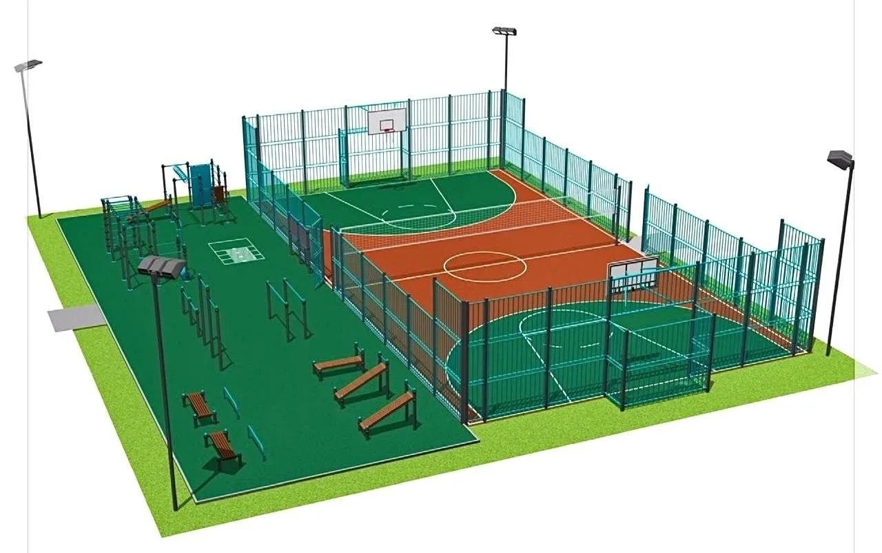 «Умная» спортивная площадка - это универсальная площадка для баскетбола, футбола, волейбола, общим размером 32х19м, трибуна на 25 мест и площадка для воркаута размером 19х12 м.