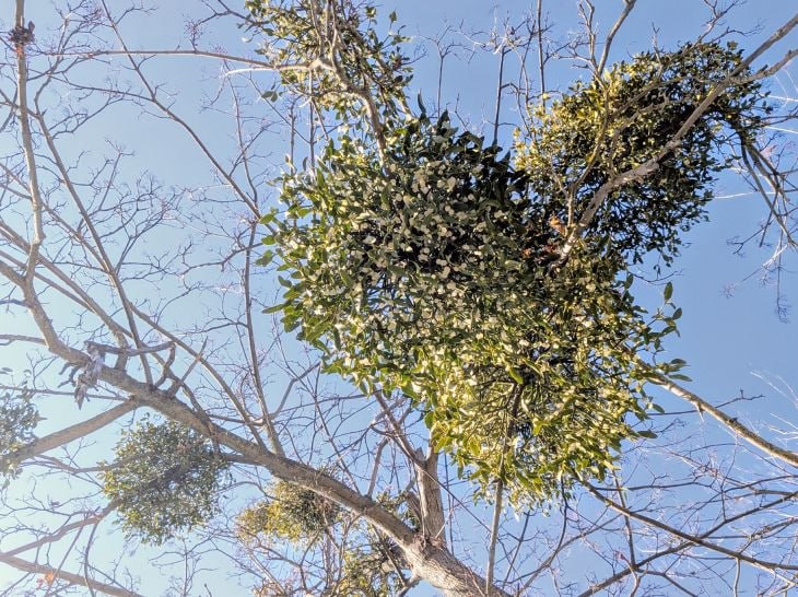Зимой омела цвела жёлтыми цветами, а сейчас её шарообразные кусты усыпаны белыми ягодами (они ядовиты).