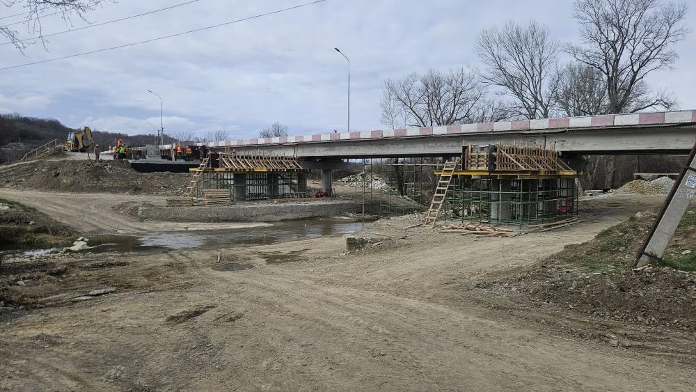 Сейчас рабочие монтируют армокаркасы и опалубку ригелей, производят укладку бетона подферменных площадок и сейсмоупоров, а также монтируют освещение.