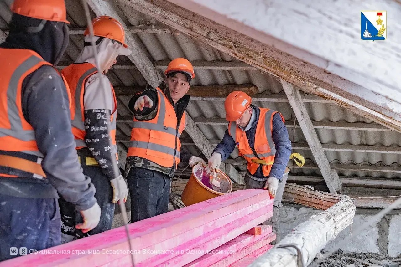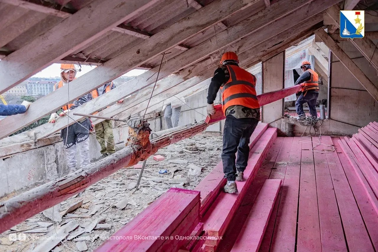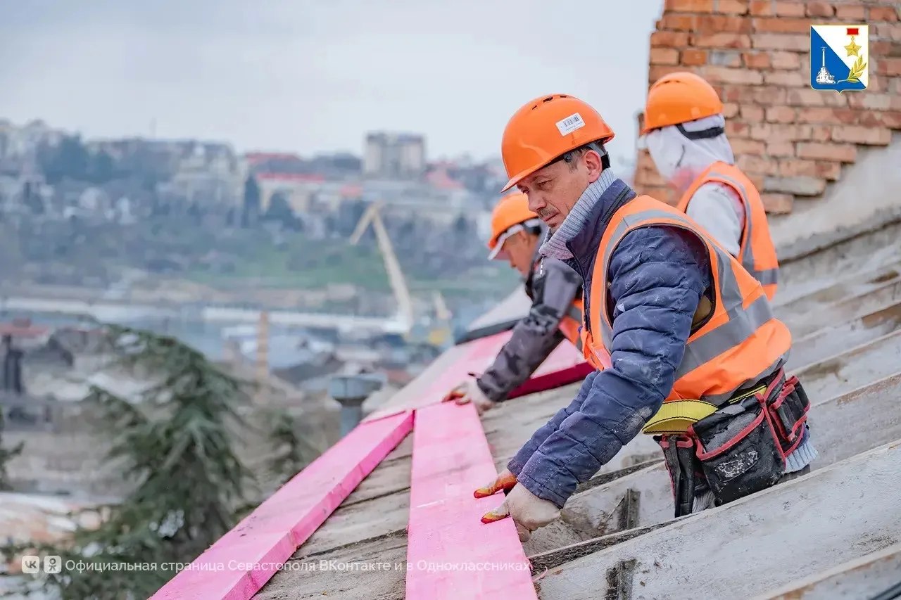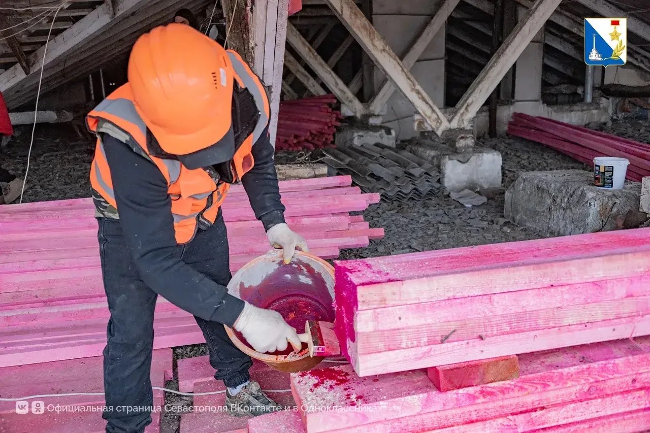 «Параллельно обрабатывают стропильную систему огнебиозащитой, монтируют гидроизоляционную пленку и новую обрешетку», — говорится в сообщении.