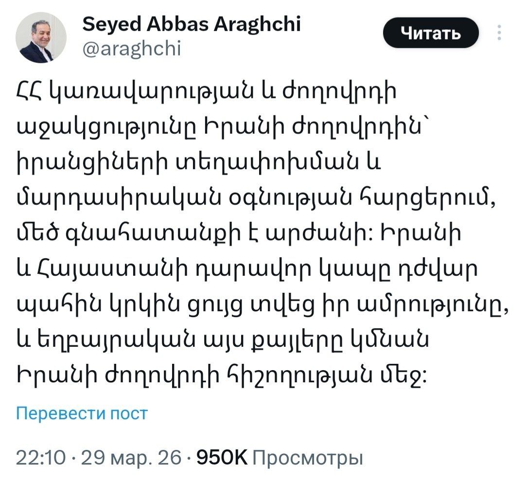 Аракчи на армянском языке отметил, что вековая дружба стран доказала свою прочность в сложный момент, и иранский народ запомнит этот братский шаг, приводит его слова @SputnikARM