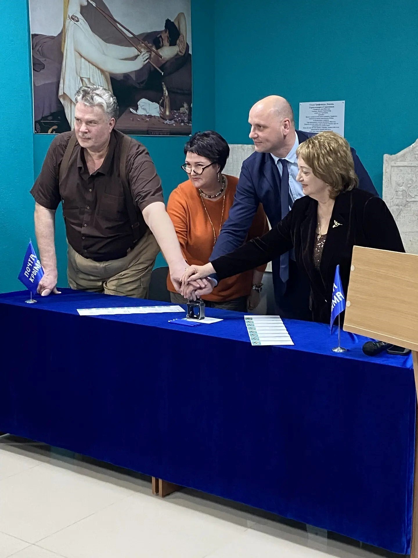 В дополнение к выпуску марки Почта России выпустила конверты первого дня и специально изготовленные почтовые штемпели для Москвы и Керчи, на которых указана дата проведения церемонии – 25 марта 2026 года. Участники церемонии поставили штемпелем оттиски и запечатлели свои подписи на почтовых конвертах.