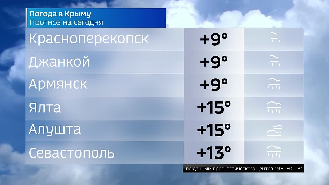 В Симферополе +11 и небольшой дождьВ Севастополе +11 и пасмурноВ Евпатории +11 и небольшой дождьВ Черноморском +12 и пасмурноВ Джанкое +13 и пасмурноВ Ялте +13 и небольшой дождьВ Алуште +13 и небольшой дождьВ Керчи +13 и небольшой дождьВ...