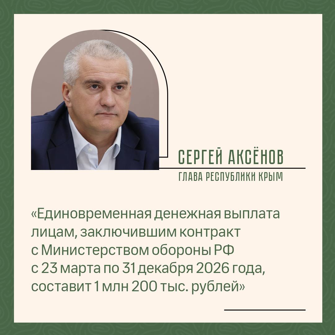 С 23 марта региональная единовременная выплата для контрактников в Крыму увеличена на 400 тысяч рублей и составляет 1,2 млн рублей. Соответствующий указ подписал Глава Республики Крым Сергей Аксёнов.