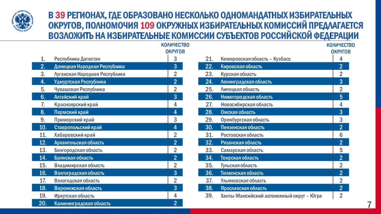 В 39 регионах, где более одного округа, полномочия 109 окружных комиссий также берут на себя региональные избиркомы.