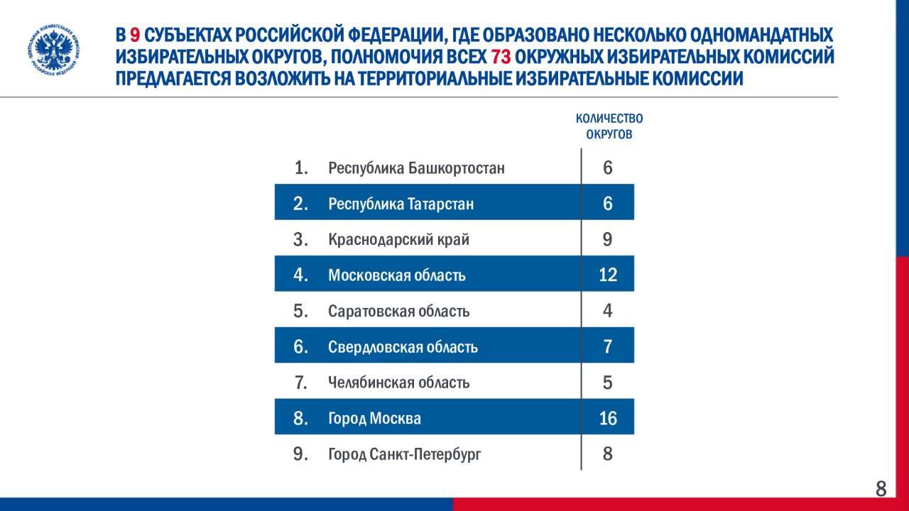 В 40 регионах с единственным одномандатным округом полномочия окружной комиссии возлагаются на ИКС РФ.