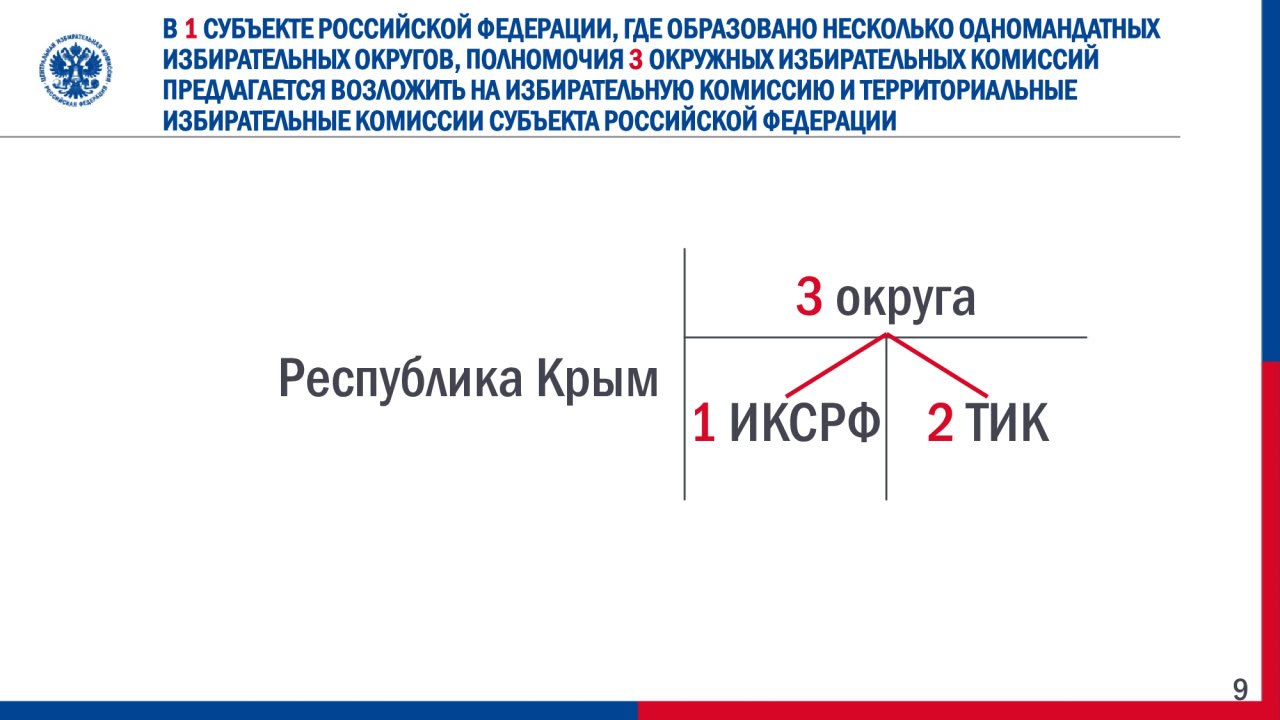 Исключение составляет Республика Крым, где в одном одномандатном округе окружной комиссией станет региональный избирком, в двух других эти полномочия возложены на местные ТИК.