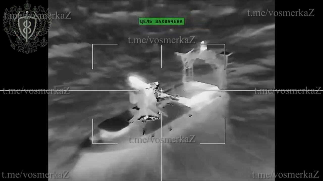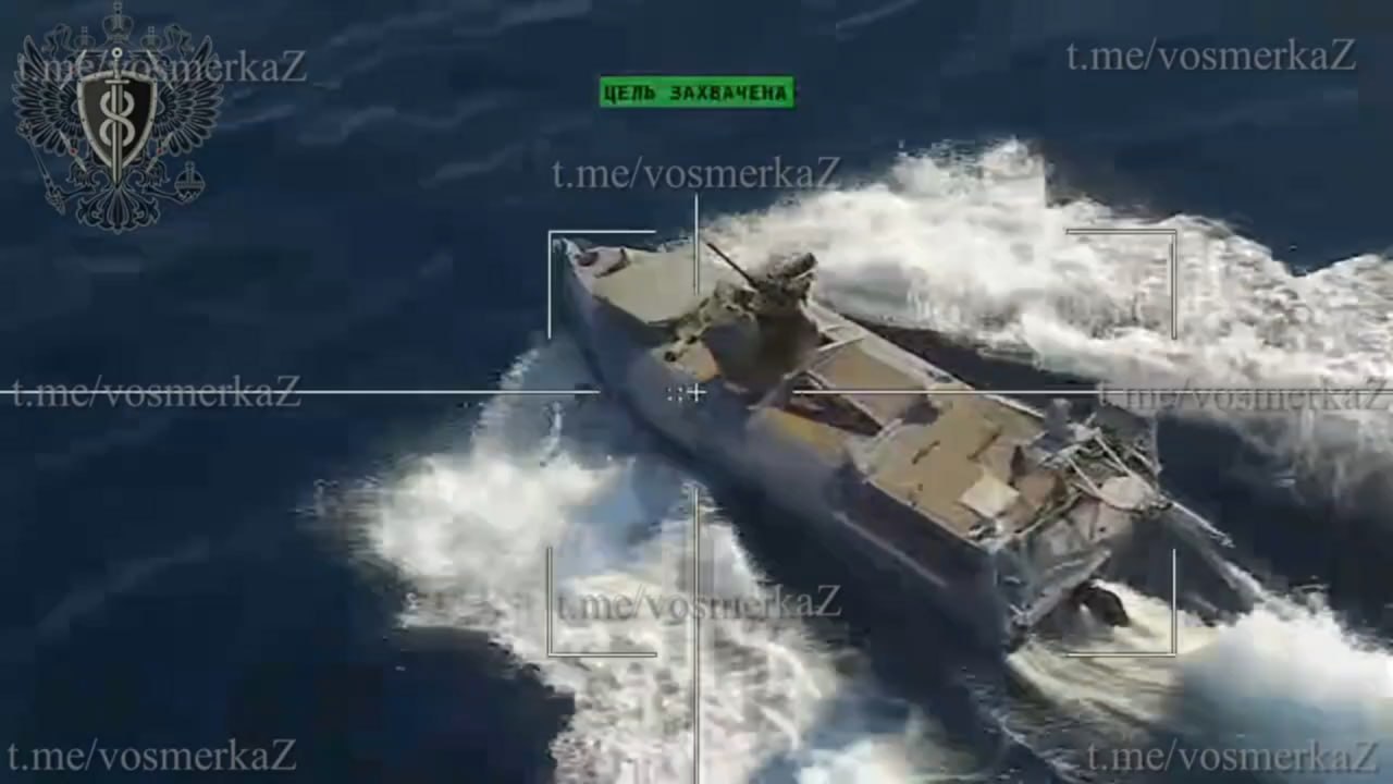 Уничтожение украинских БЭК с турелями при помощи дронов-камикадзе "Ланцет" в Черном море. Видео: @vosmerkaZ