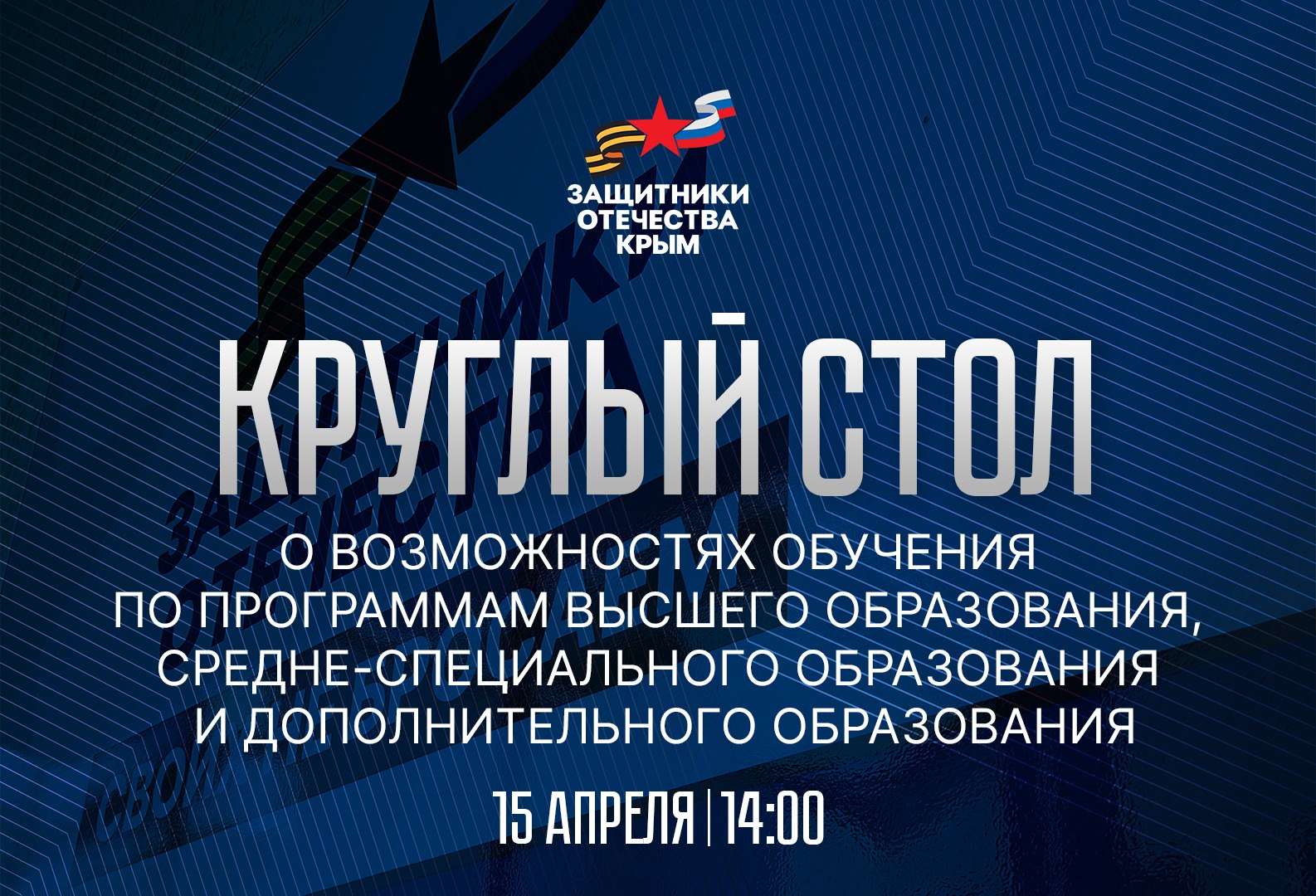 15 апреля в 14:00 в Крымском федеральном университете им. В.И. Вернадского, в Зале заседаний ученого совета (проспект Академика Вернадского, 4) при поддержке фонда «Защитники Отечества» пройдёт заседание круглого стола на тему: «О возможностях обучения по программам высшего образования, средне-специального образования и дополнительного образования».