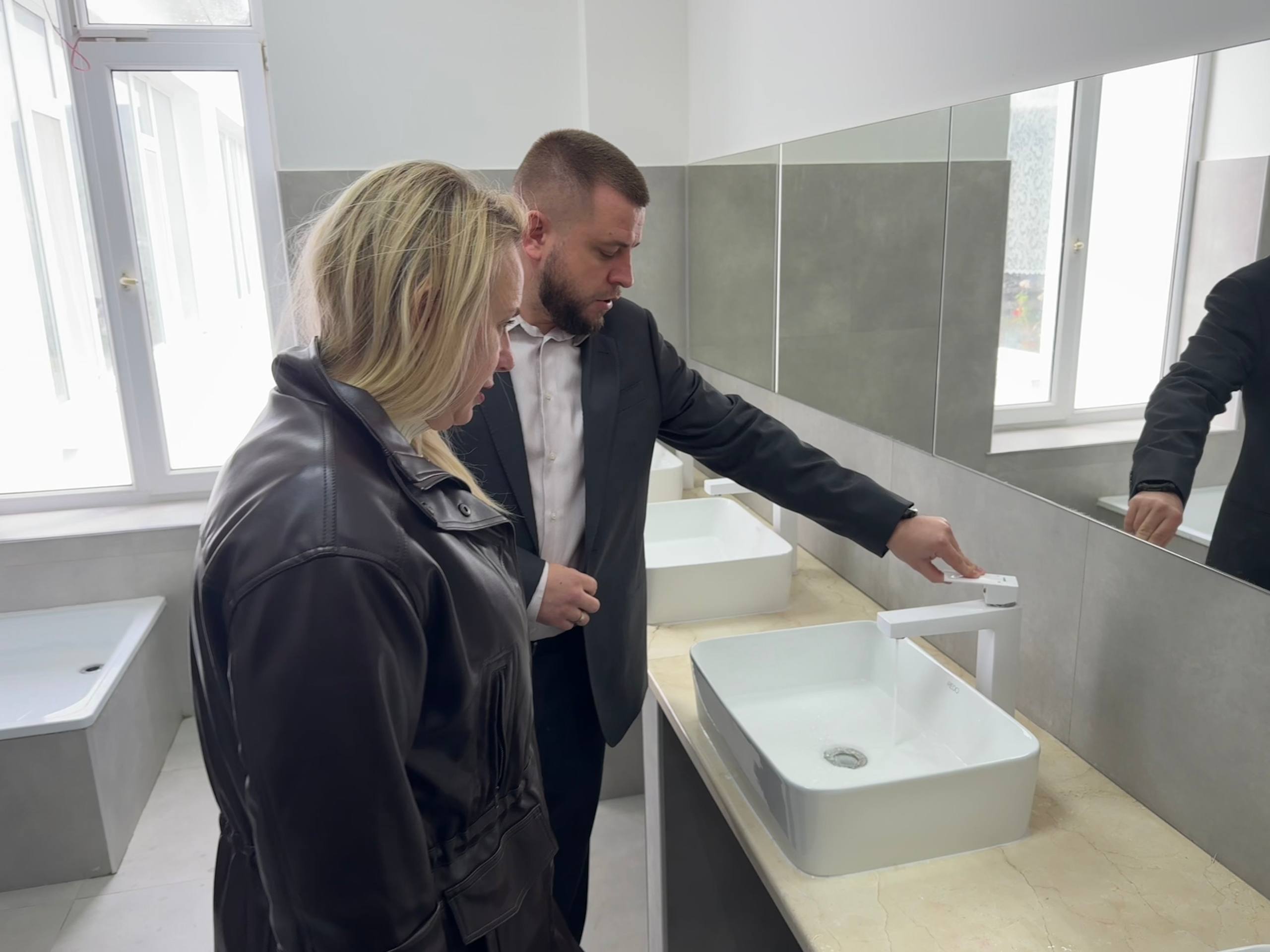 В ходе визита осмотрели сельскую школу, где в декабре прошлого года был завершён ремонт. Отмечу, что проделана значительная работа: выполнено благоустройство прилегающей территории и проведён капитальный ремонт кровли. Помимо этого обустроены новые современные санитарные помещения, оснащённые всем необходимым оборудованием: установлены новые раковины, смесители, водонагреватели, радиаторы отопления, зеркала, сушильное оборудование, кабинки, выполнены работы по замене плитки на новую.