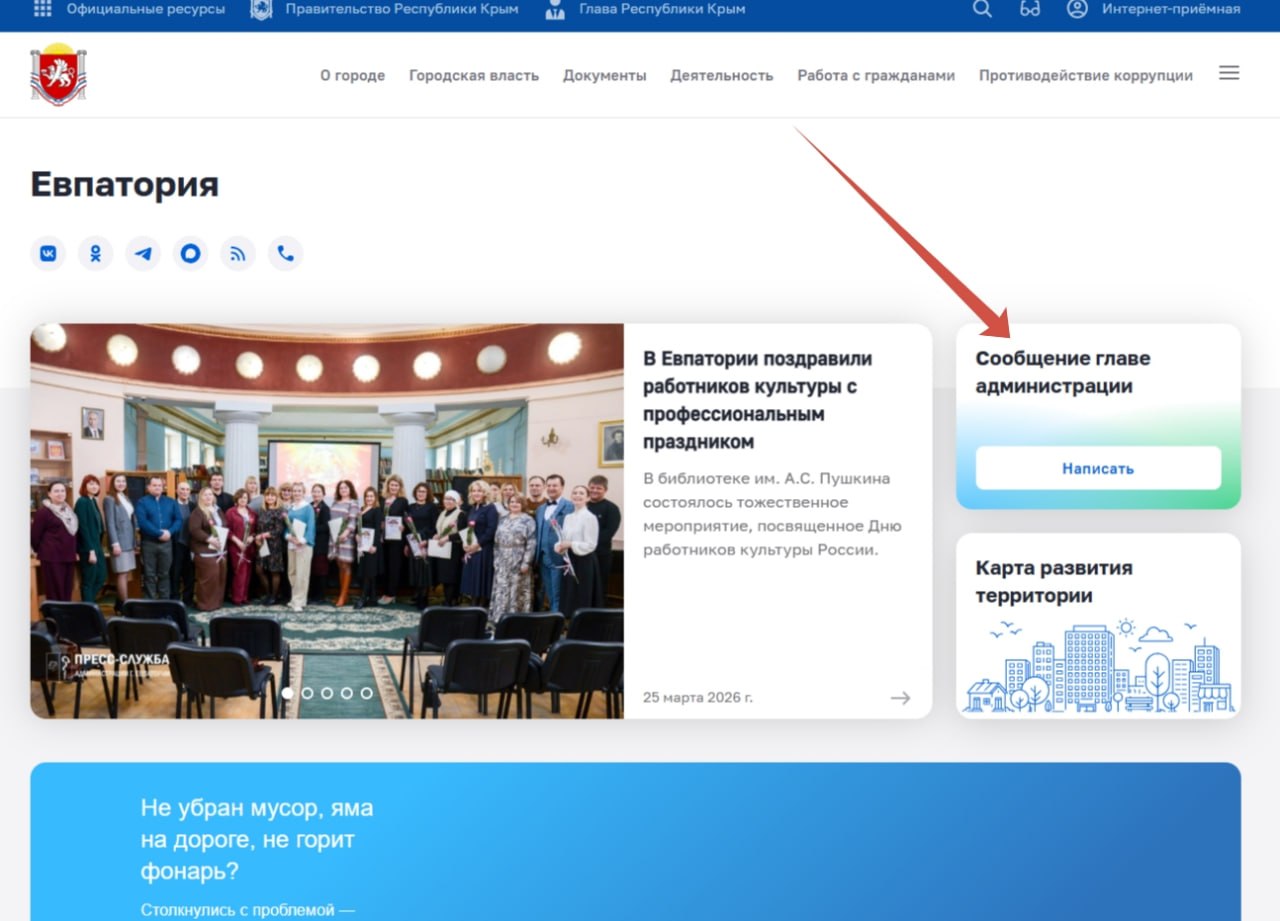 Для вашего удобства на официальном портале Правительства Республики Крым создана специальная вкладка «Сообщение главе администрации города Евпатории».