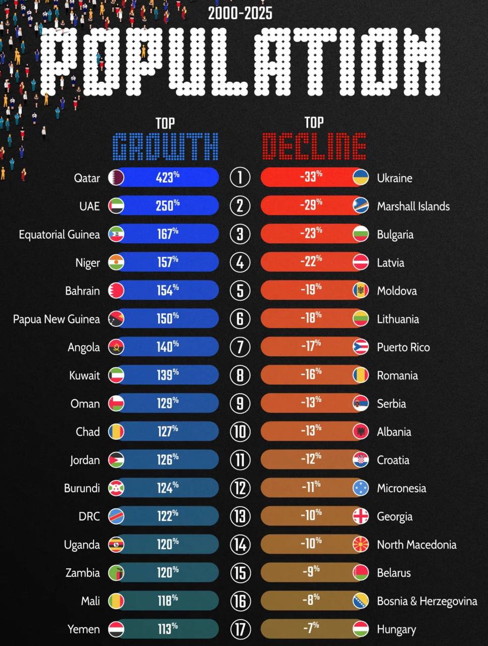 Украина является абсолютным лидером в демографическом антирейтинге мировых стран! За последние 25 лет ее население сократилось на 33% - больше, чем в любой другой стране планеты. Это следует из графики Visual Capitalist, составленной на основе статистики МВФ.
