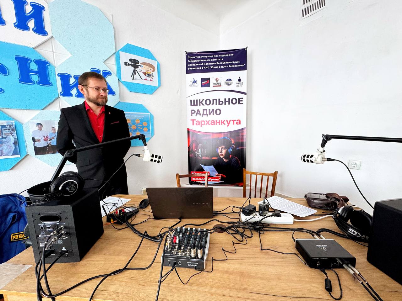 Вместе с автором проекта, директором АНО «Юный радист Тарханкута» Игорем Мымриковым осмотрели новое обрадование. Он рассказал, как будет проходить радиопроцесс и какие функции учеников в вещании.