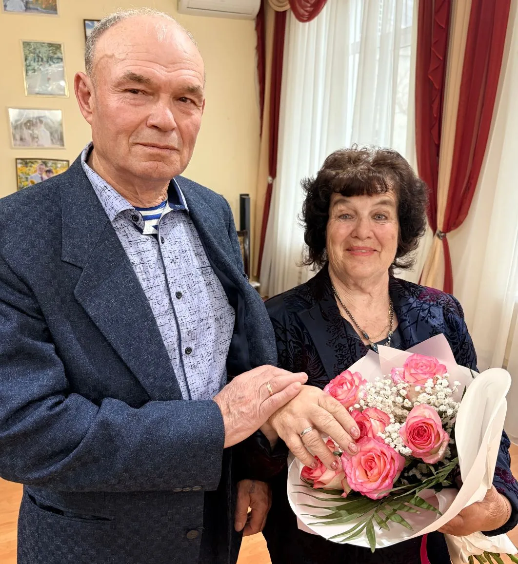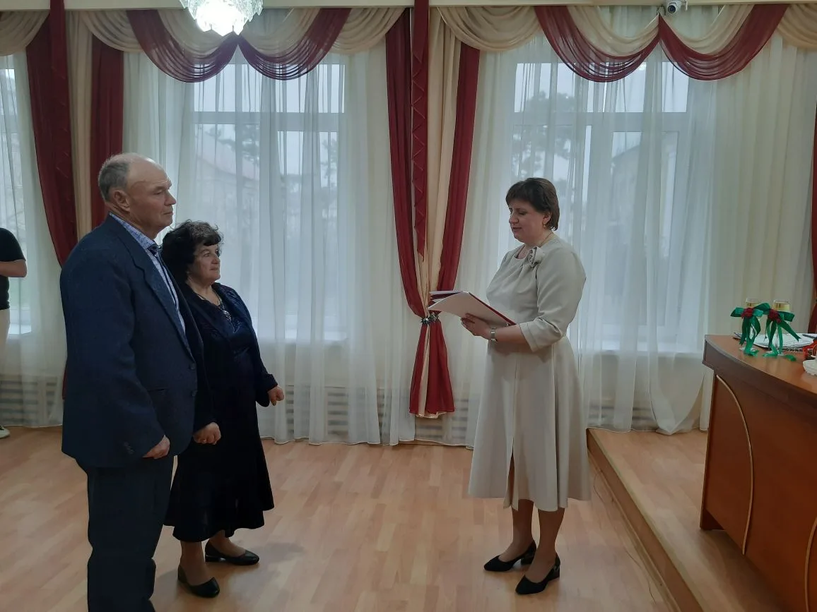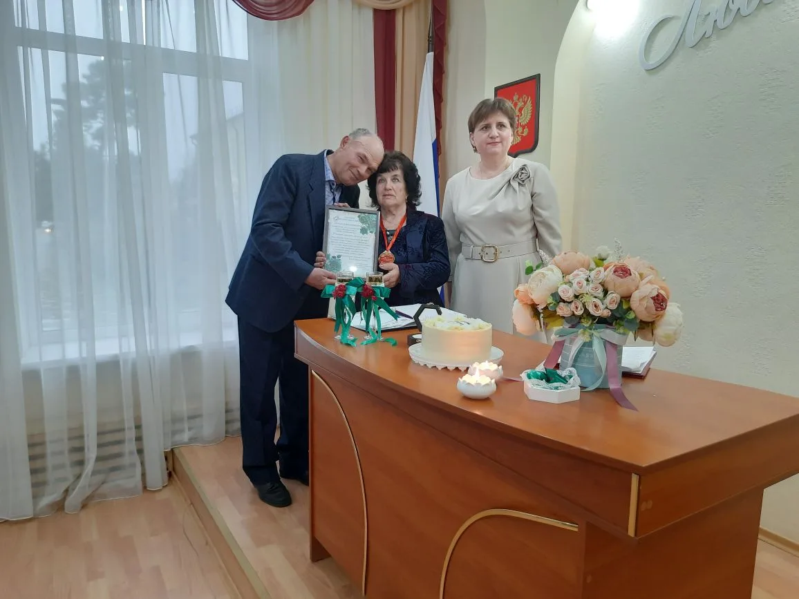 На торжестве в отделе ЗАГС юбиляры обменялись кольцами, поставили подписи в Книге Памятных дат и получили памятную медаль и памятный адрес от Департамента ЗАГС.