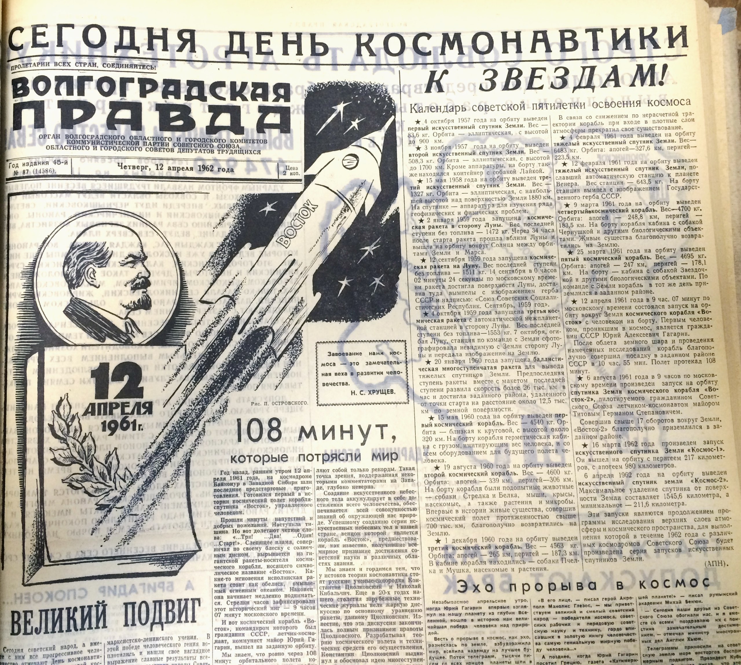 Советский космонавт Юрий Гагарин 12 апреля 1961 года на космическом корабле «Восток-1» стартовал с космодрома Байконур и впервые в мире совершил орбитальный облёт Земли. Полёт продлился 108 минут.