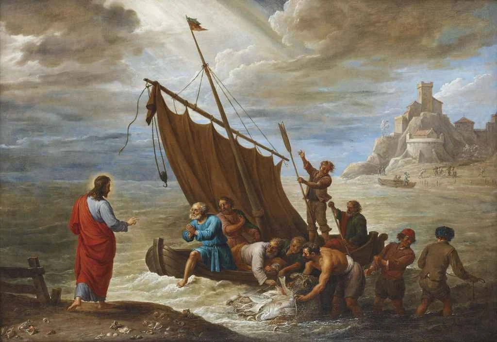 И вот воскресший Христос встречает их на берегу Тивериадского озера после этой жуткой ночи. И когда они вытащили целый улов, так что сети чуть не разорвались, Пётр бросается к Христу.