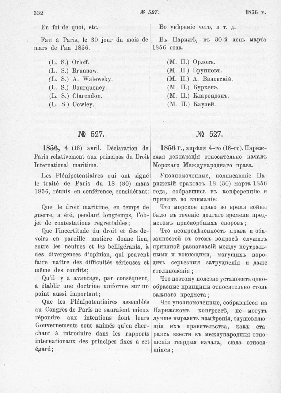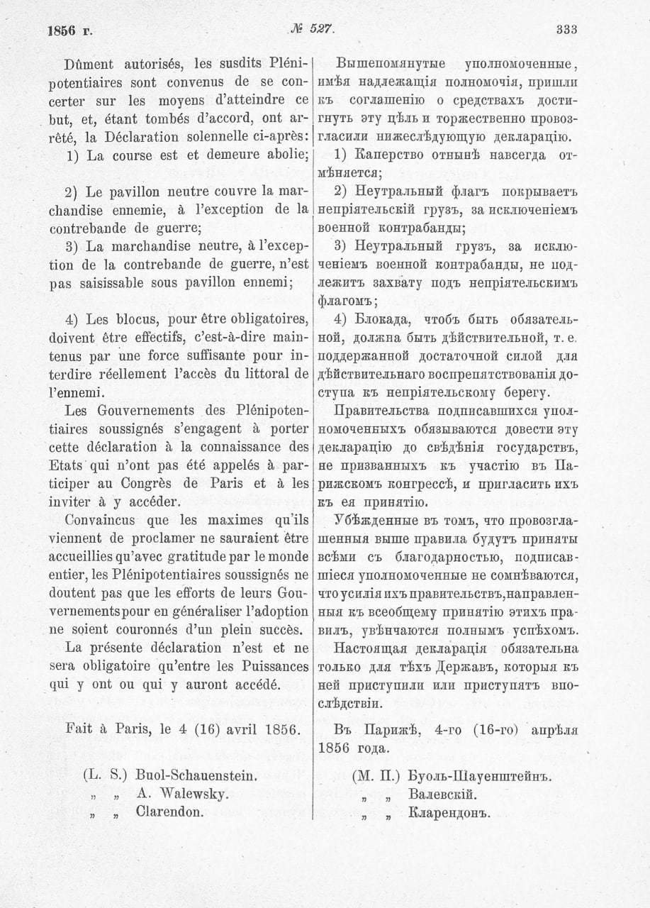 Декларация о принципах морского международного права была подписана и вступила в силу 16 апреля 1856 года в контексте Парижского мирного договора, положившего конец Крымской войне.