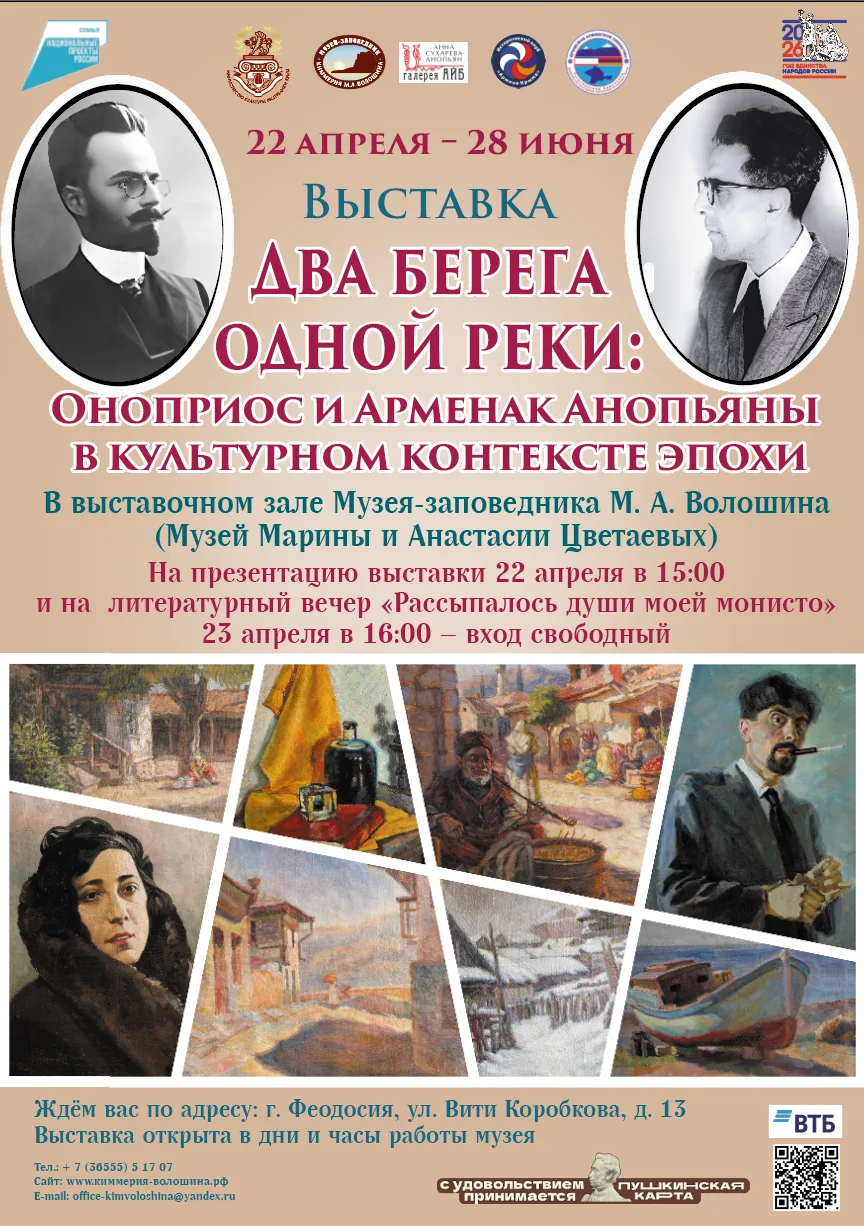 В выставочном зале Музея-заповедника «Киммерия М. А. Волошина» под эгидой Министерства культуры Республики Крым 22 апреля 2026 года в 15:00 состоится презентация выставки из коллекции семьи Анопьян-Сухаревых, которая посвящена поэту, переводчику и культурному деятелю Серебряного века Оноприосу Анопьяну (1873 – 1934) и его сыну – художнику Арменаку Анопьяну (1908 – 1976), одному из лучших учеников члена Императорской Академии художеств, а позже – заслуженного деятеля искусств РСФСР, мастера батальной живописи Николая Самокиша.