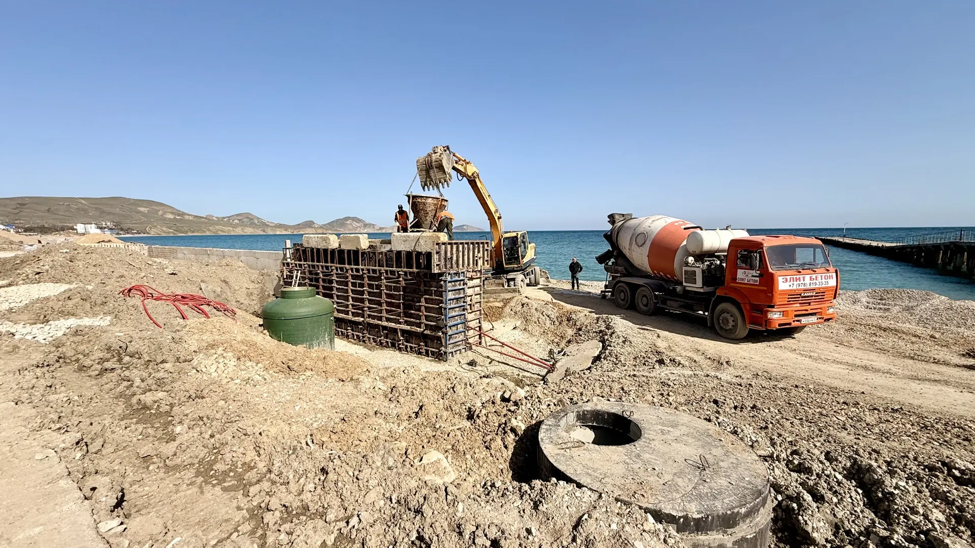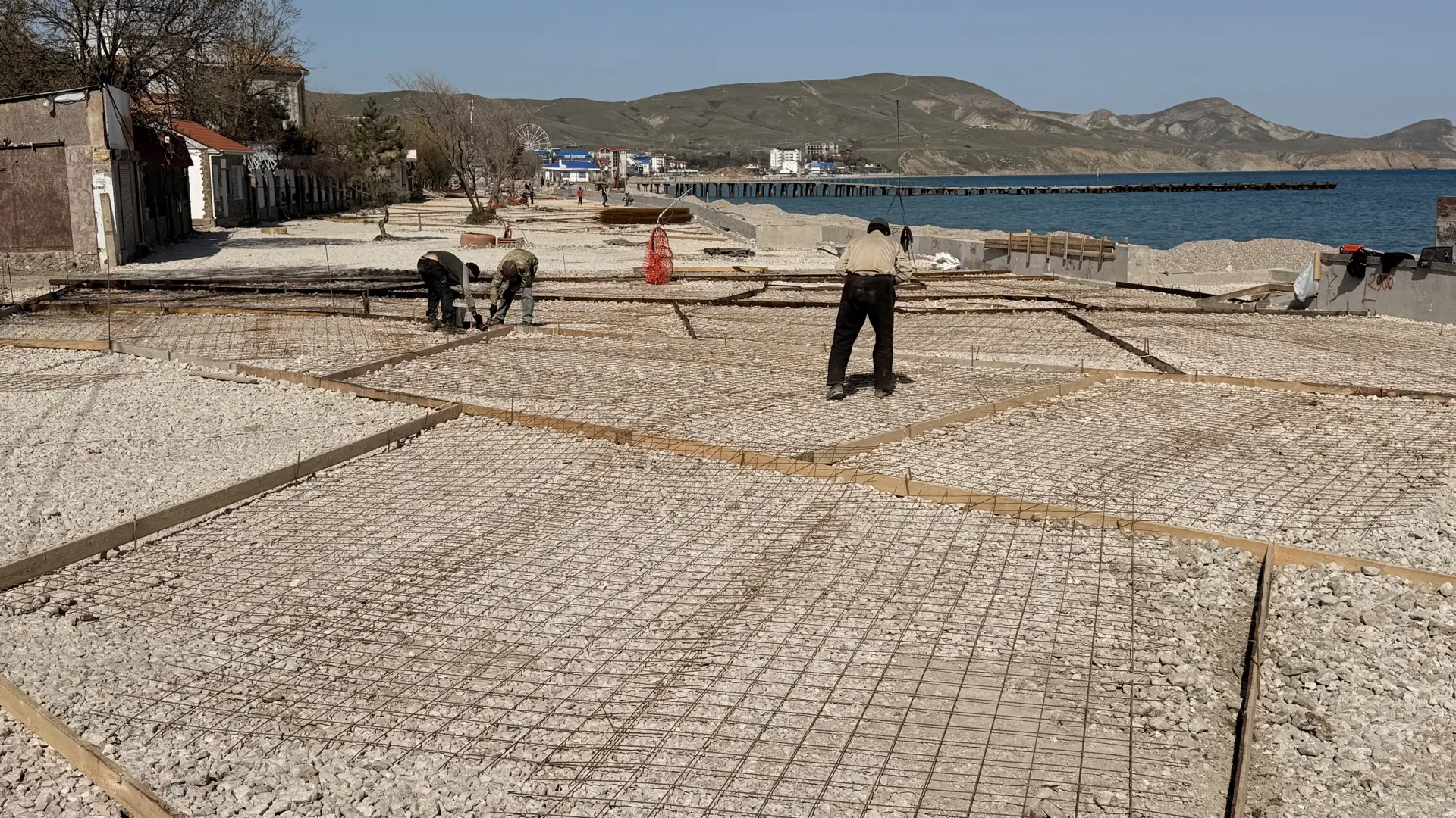 На данный момент ведутся работы по заливке корневой части буны и бетонированию противооползневых конструкций, монтажу пандусов и лестничных маршей, облицовке оградительной стены и устройству парапетов.