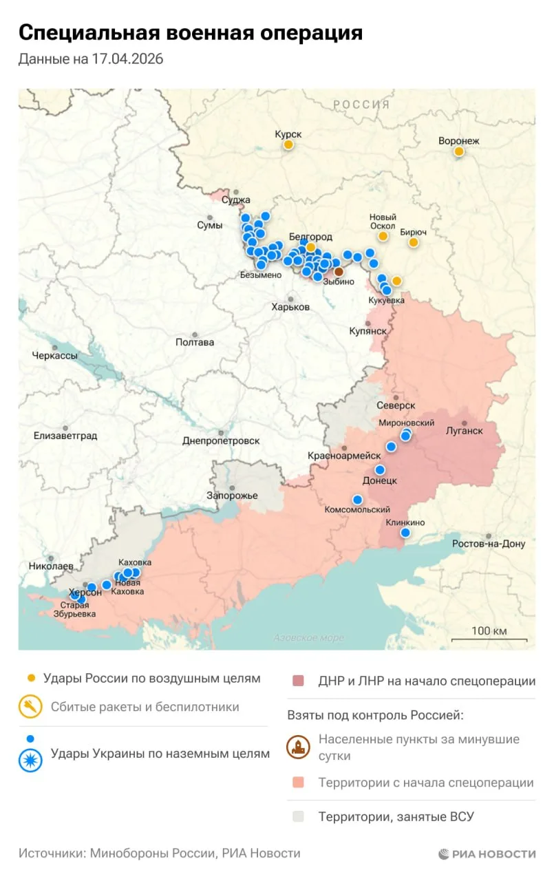за 17 апреля 2026 годаРоссийские войска в течение суток нанесли удары по объектам в прифронтовых регионах т.н. Украины. В Чернигове прилет пришелся по городской ТЭЦ, а в Кривом Роге «Герани» поразили подстанцию 150 кВ ЮГОК.Украинские...