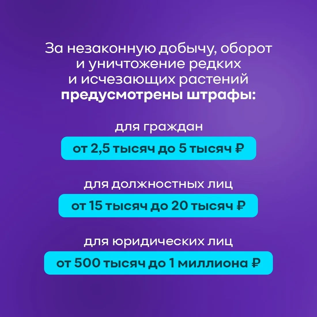 Причинение вреда редким и находящимся под угрозой исчезновения видам животных, растений или других организмов, занесенных в Красную книгу Российской Федерации и (или) охраняемых международными договорами Российской Федерации, в том числе их уничтожение. Уничтожение редких и находящихся под угрозой исчезновения видов животных, растений или других организмов, занесенных в Красную книгу Российской Федерации и (или) охраняемых международными договорами Российской Федерации, либо действия (бездействие), которые могут привести к гибели, сокращению численности либо нарушению среды обитания этих видов животных, растений или других организмов, либо добыча, хранение, перевозка, сбор, содержание, приобретение, продажа либо пересылка видов указанных животных, растений или других организмов, их продуктов, частей либо дериватов без надлежащего на то разрешения или с нарушением условий, предусмотренных разрешением, либо с нарушением иного установленного порядка, если эти действия не содержат признаков уголовно наказуемого деяния, - влекут наложение административного штрафа на граждан в размере от двух тысяч пятисот до пяти тысяч рублей с конфискацией орудий добычи животных, растений или других организмов, а также самих животных, растений или других организмов, их продуктов, частей либо дериватов или без таковой; на должностных лиц - от пятнадцати тысяч до двадцати тысяч рублей с конфискацией орудий добычи животных, растений или других организмов, а также самих животных, растений или других организмов, их продуктов, частей либо дериватов или без таковой; на юридических лиц - от пятисот тысяч до одного миллиона рублей с конфискацией орудий добычи животных, растений или других организмов, а также самих животных, растений или других организмов, их продуктов, частей либо дериватов или без таковой.