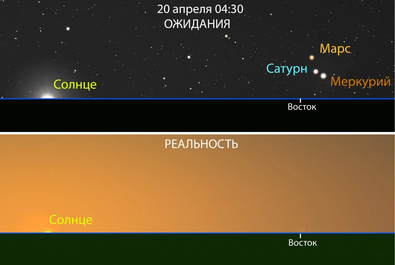 Учёные предполагают, что максимальное сближение планет произойдёт 20 и 21 апреля (утром в понедельник и во вторник).