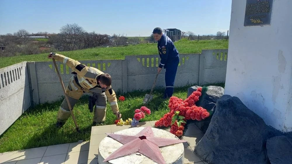 Пожарные очистили территории от сухой травы и мусора, обновили покраску оградки и скосили траву, а также возложили цветы.