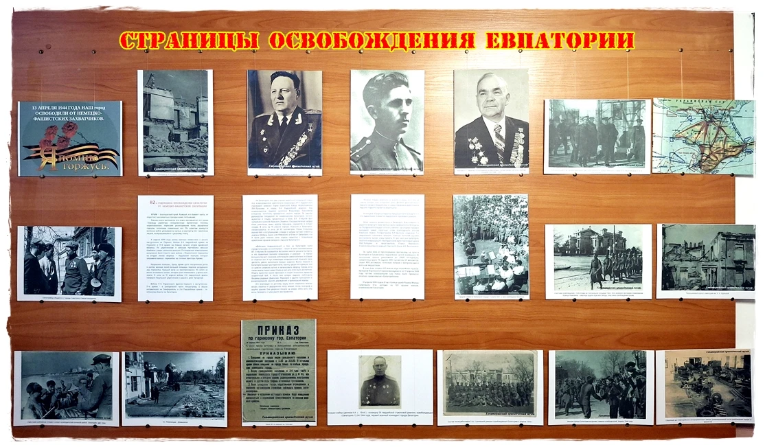 Экспозиция включает фотоотпечатки с сайта Евпаторийского краеведческого музея, а также материалы из открытых интернет-источников, которые знакомят посетителей с участниками боев за Евпаторию, а также с видами города в период оккупации и после освобождения.