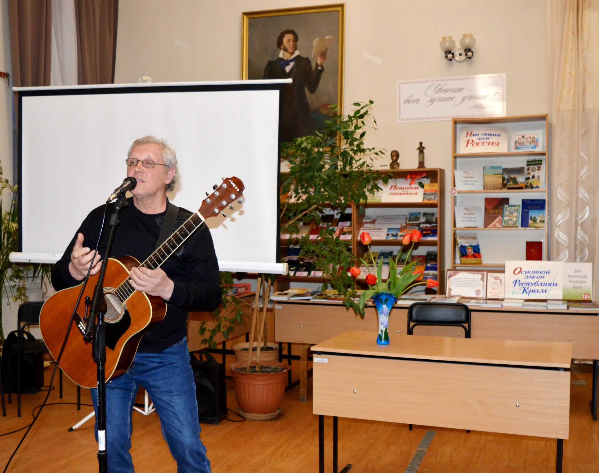 18 апреля в Центральной городской библиотеке им. А. С. Пушкина прошла литературно-музыкальная программа «Праздник тех, кто любит книгу» в рамках Всероссийской акции «Библионочь-2026», приуроченной к Году единства народов России. Тема акции — «Единство России – сила народов!».