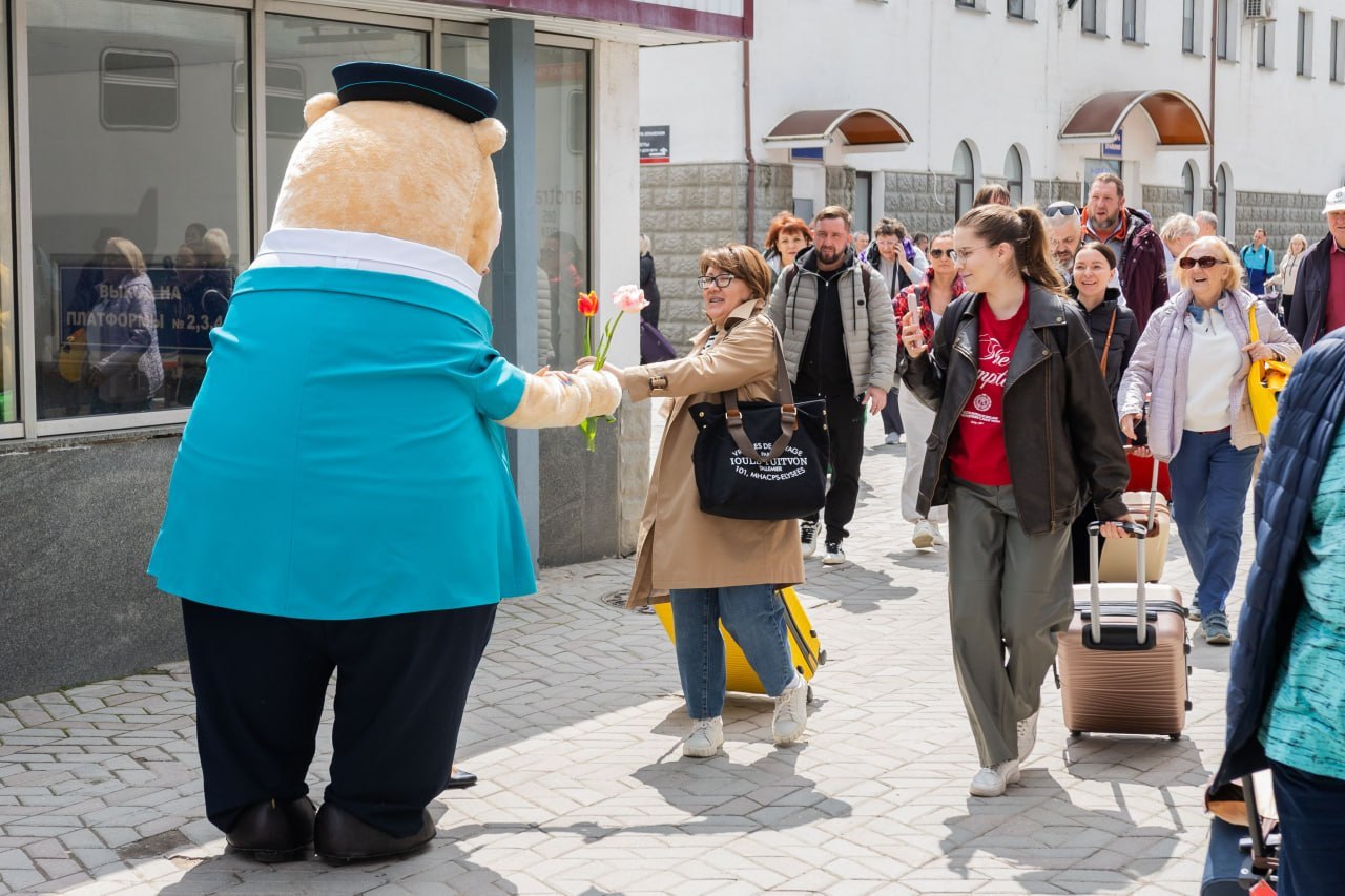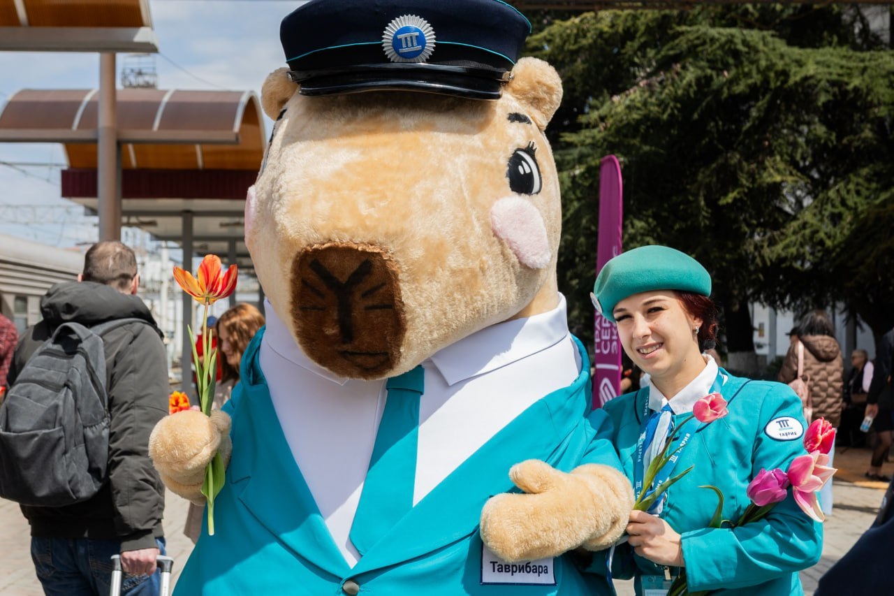 Так, каждой даме, вышедшей на перрон из прибывших поездов, дарили яркого представителя семейства лилейных, выросшего на выставочной экспозиции, созданной руками крымских селекционеров. Всего подарили более 300 тюльпанов классических и пионовидных сортов.