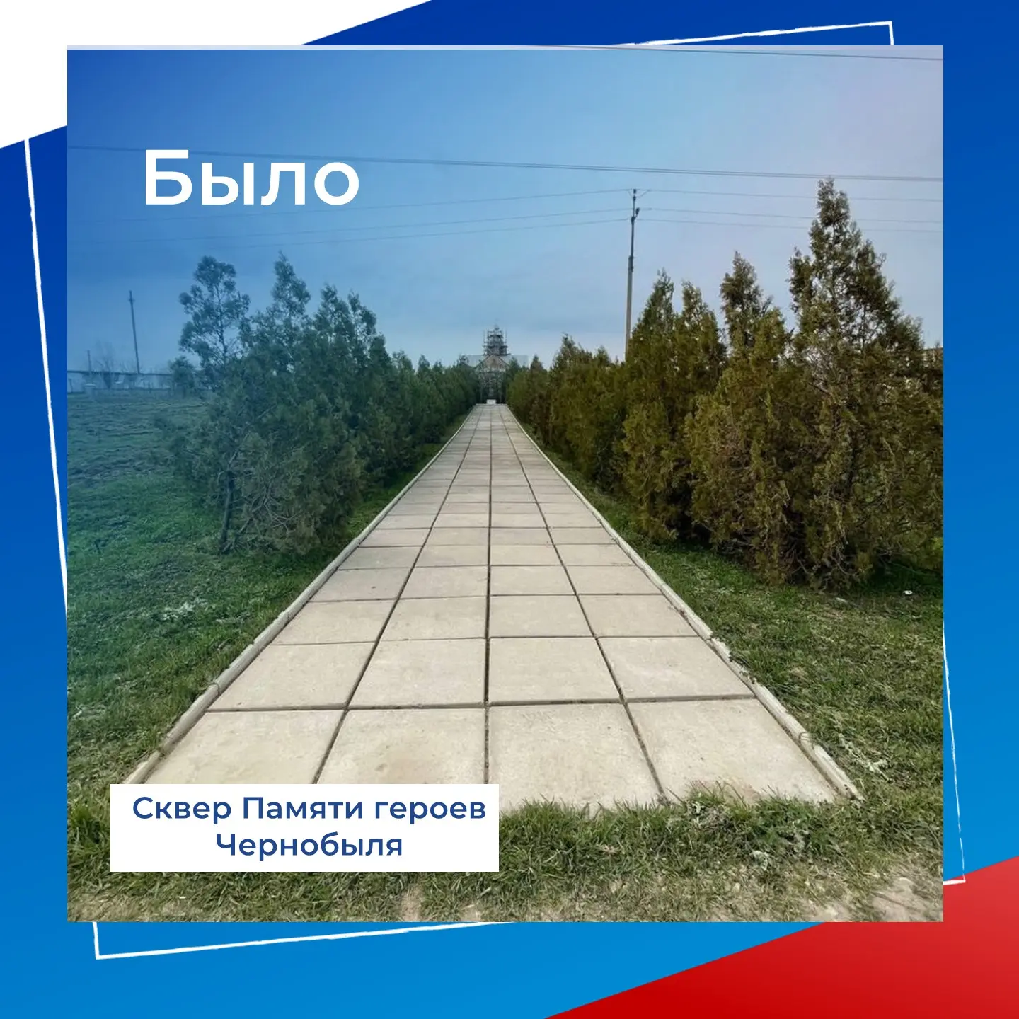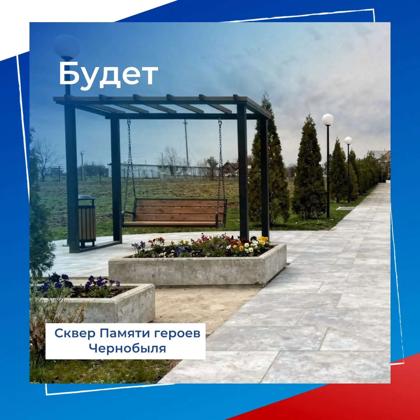 Сквер Памяти героев Чернобыля (ул. им. Леонида Рябики) — укладка плитки, скамейки, урны, освещение, клумбы, газоны.