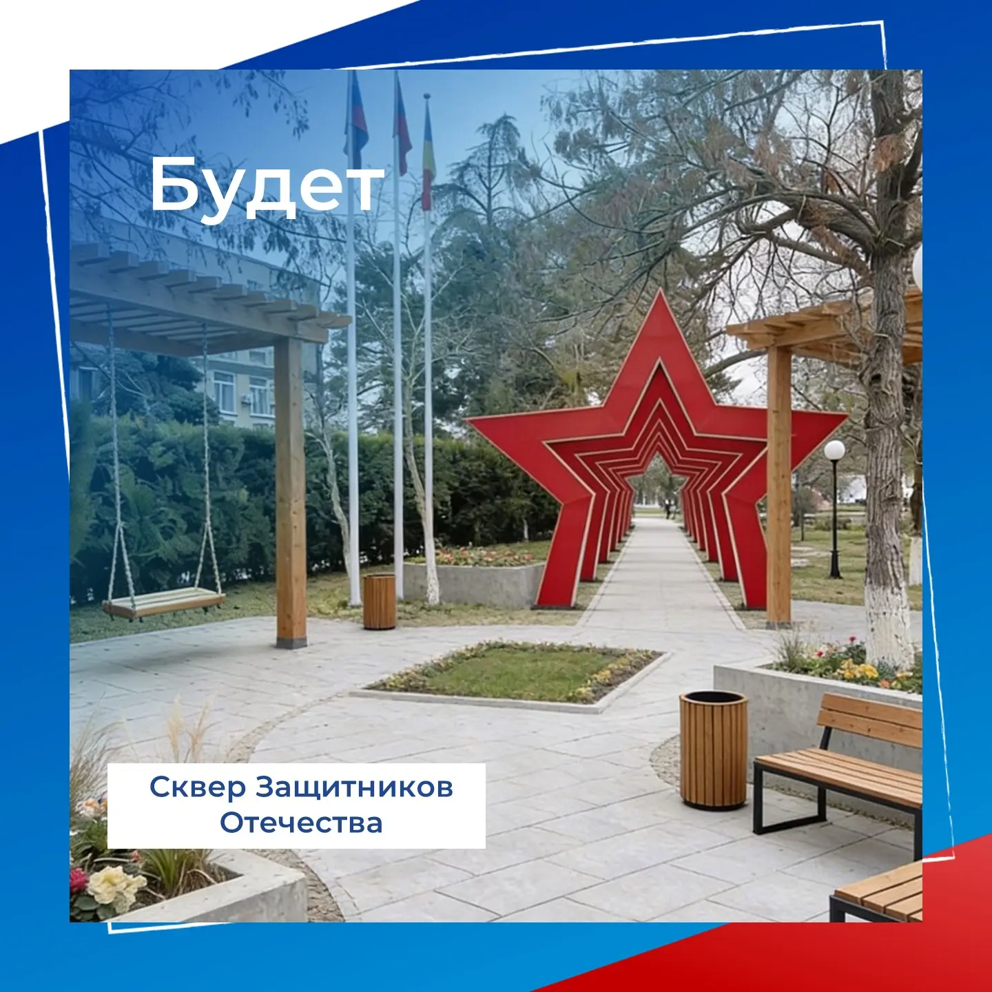 Сквер Защитников Отечества (центральная ул. Ленина, у зданий администрации и библиотеки) — комплексное благоустройство: плитка, малые архитектурные формы, освещение, озеленение.