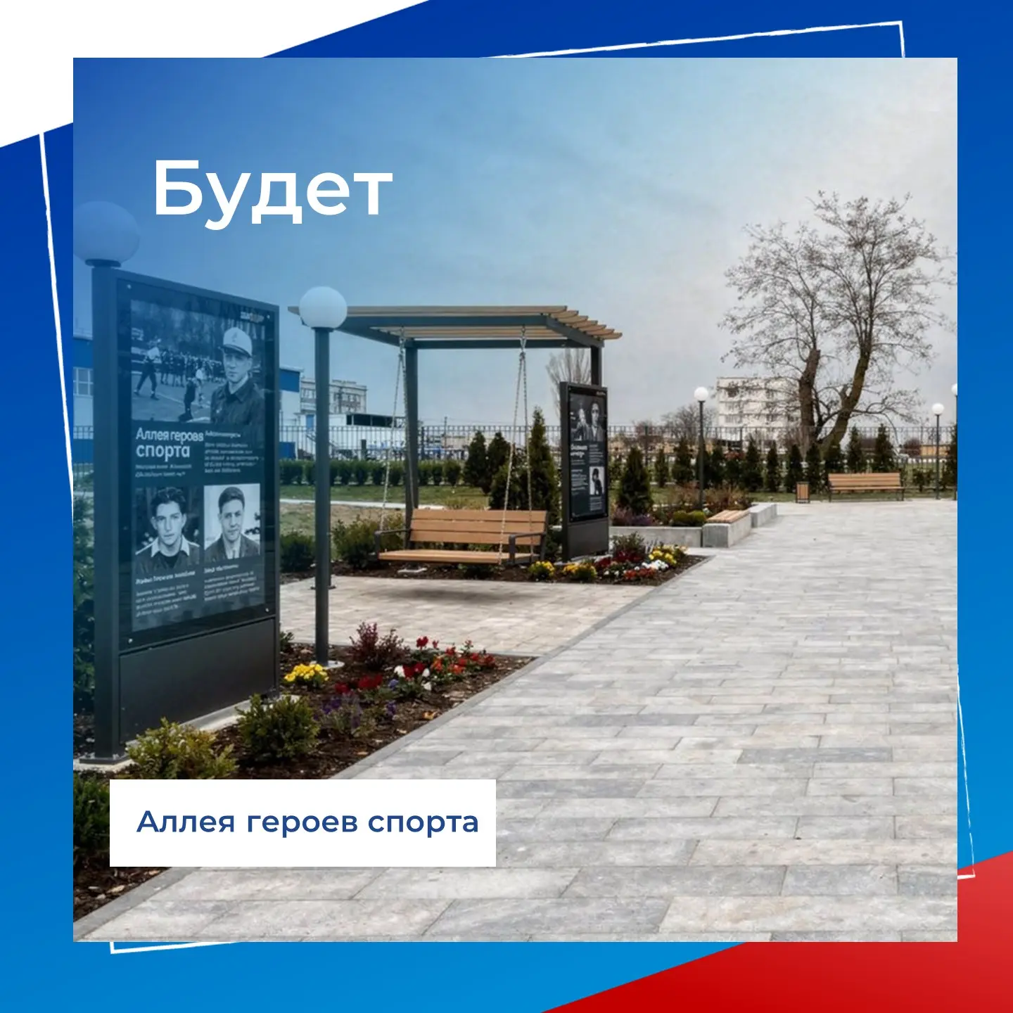 Аллея героев спорта (между парком культуры и центральным стадионом) — благоустройство: плитка, скамейки, урны, освещение, клумбы, газоны.
