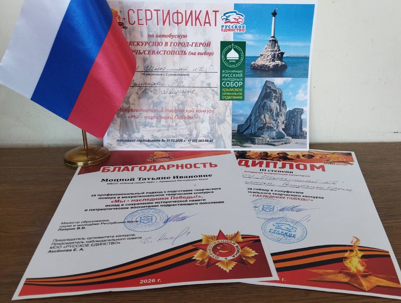 Команда 2Б класса школы-лицея № 2 города Армянска, под руководством Татьяны Ивановны Моцной, блестяще выступила в полуфинале межрегионального конкурса «Мы - наследники Победы» в г. Джанкой.