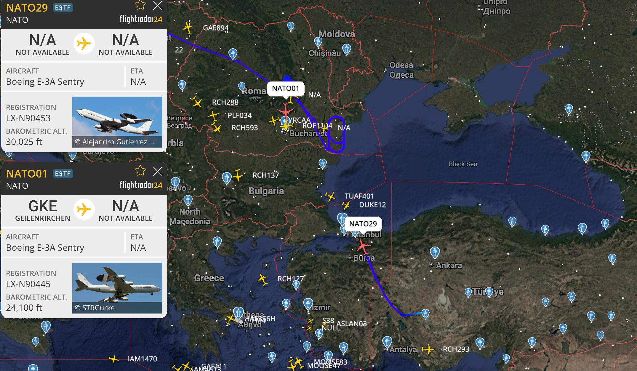 Boeing E-3A Sentry, мониторивший район Туапсе-Новороссийск до и во время ударов, вылетел с турецкой авиабазы Конья и взял курс на Румынию, где уже работает такой же борт. Оттуда они обычно наблюдают за Крымом и дальше в сторону Мариуполя.