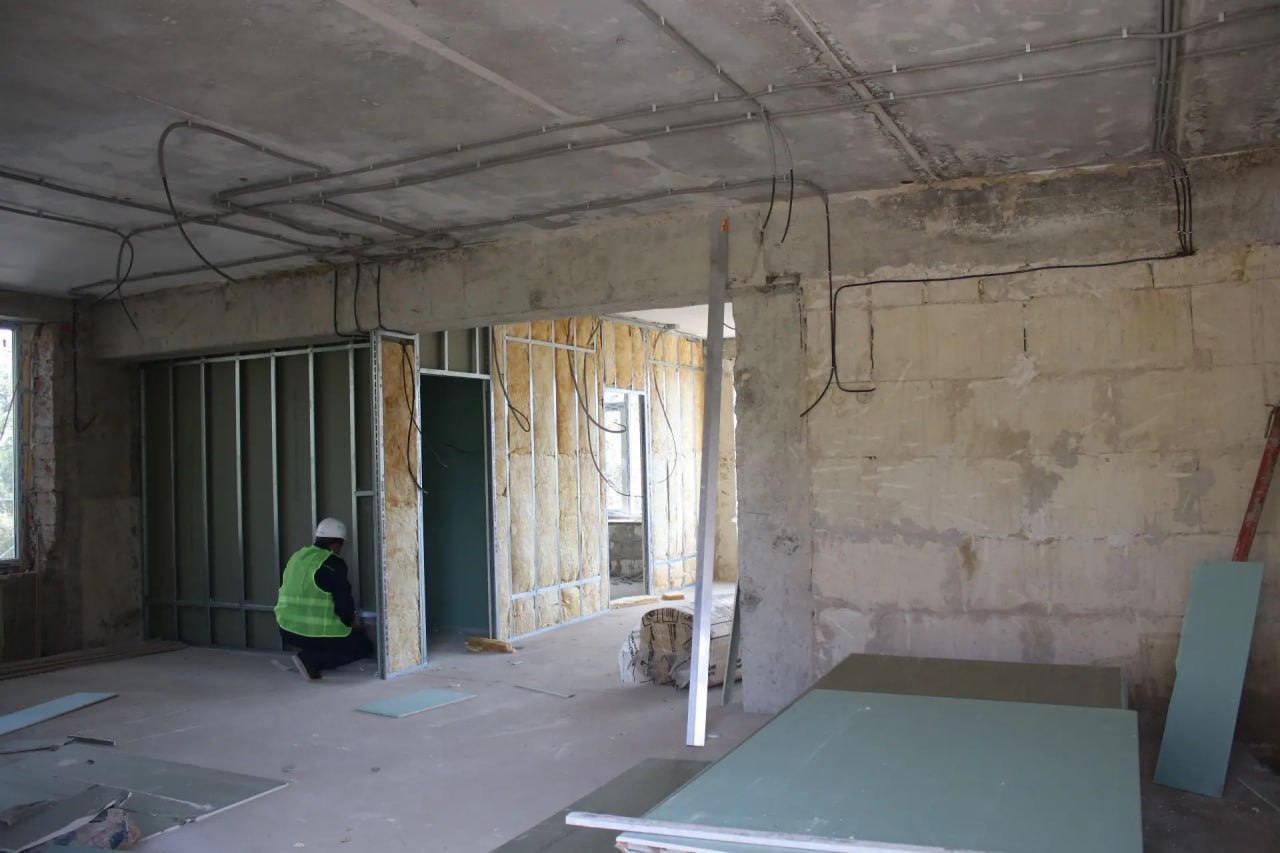 На объекте одновременно ведутся разные виды работ: в одних помещениях демонтируют старые конструкции, в других уже устанавливают оконные блоки, выполняют устройство стяжки и внутренних инженерных сетей.