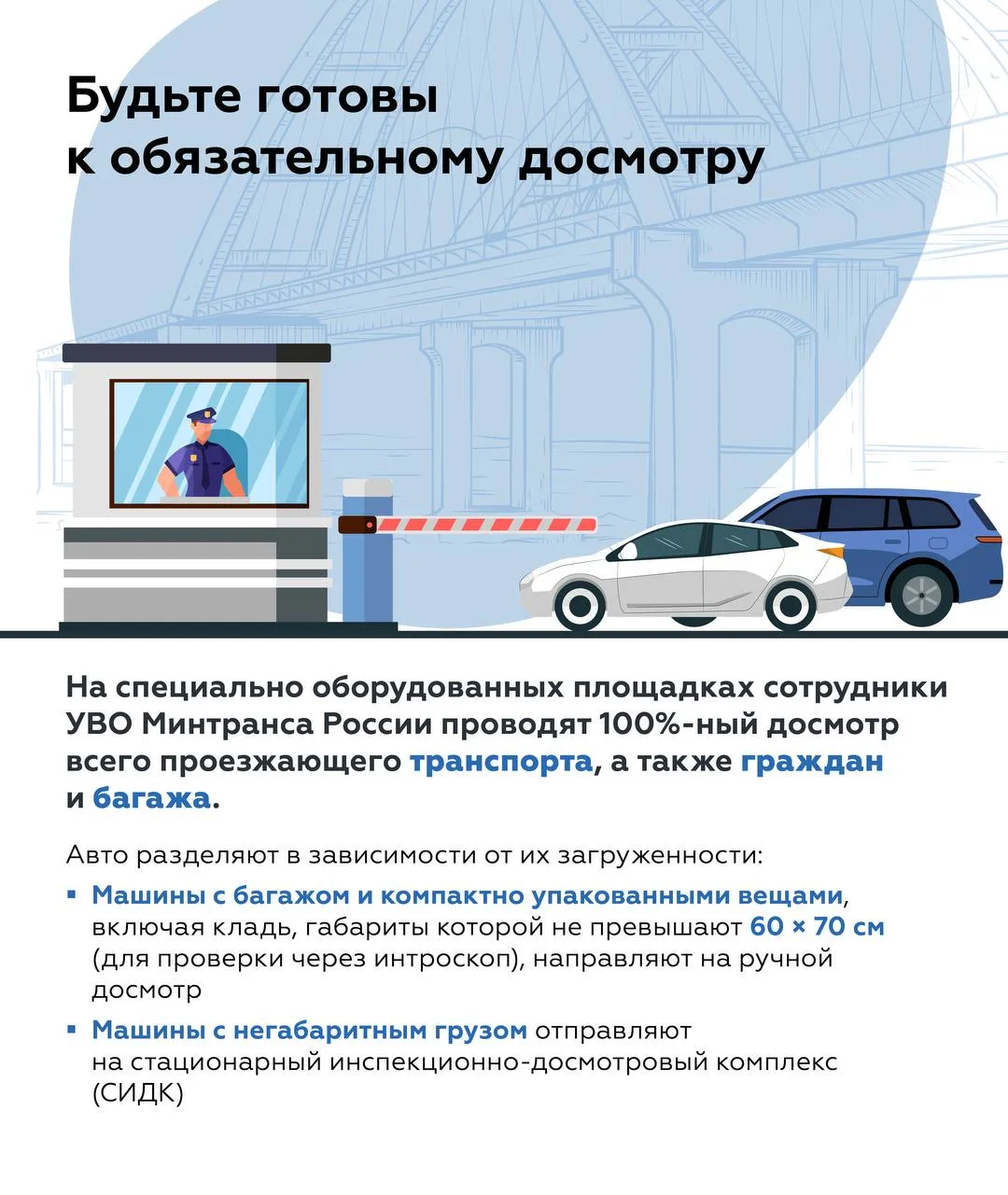 Как упаковать багаж, чтобы досмотр занял минимум времени, что можно брать с собой в поездку, а что нельзя, и какие машины не пустят на мост — главное об этом в карточках Минтранса. Сохраните себе, чтобы долго не искать перед отпуском.