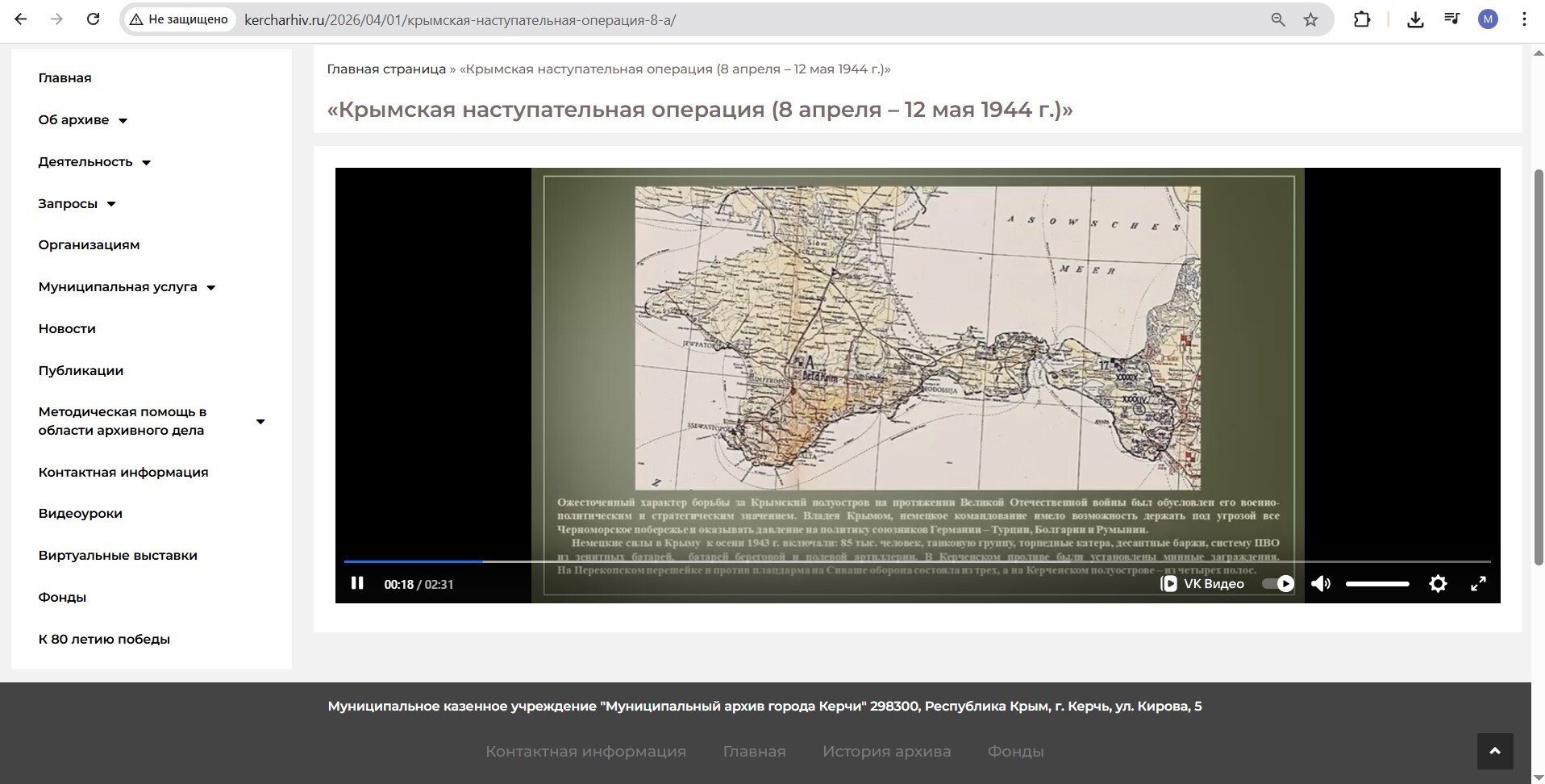 К 82-й годовщине освобождения Крымского полуострова от немецко-фашистских захватчиков муниципальным архивом города Керчи подготовлена виртуальная выставка «Крымская наступательная операция (8 апреля – 12 мая 1944 г.)».