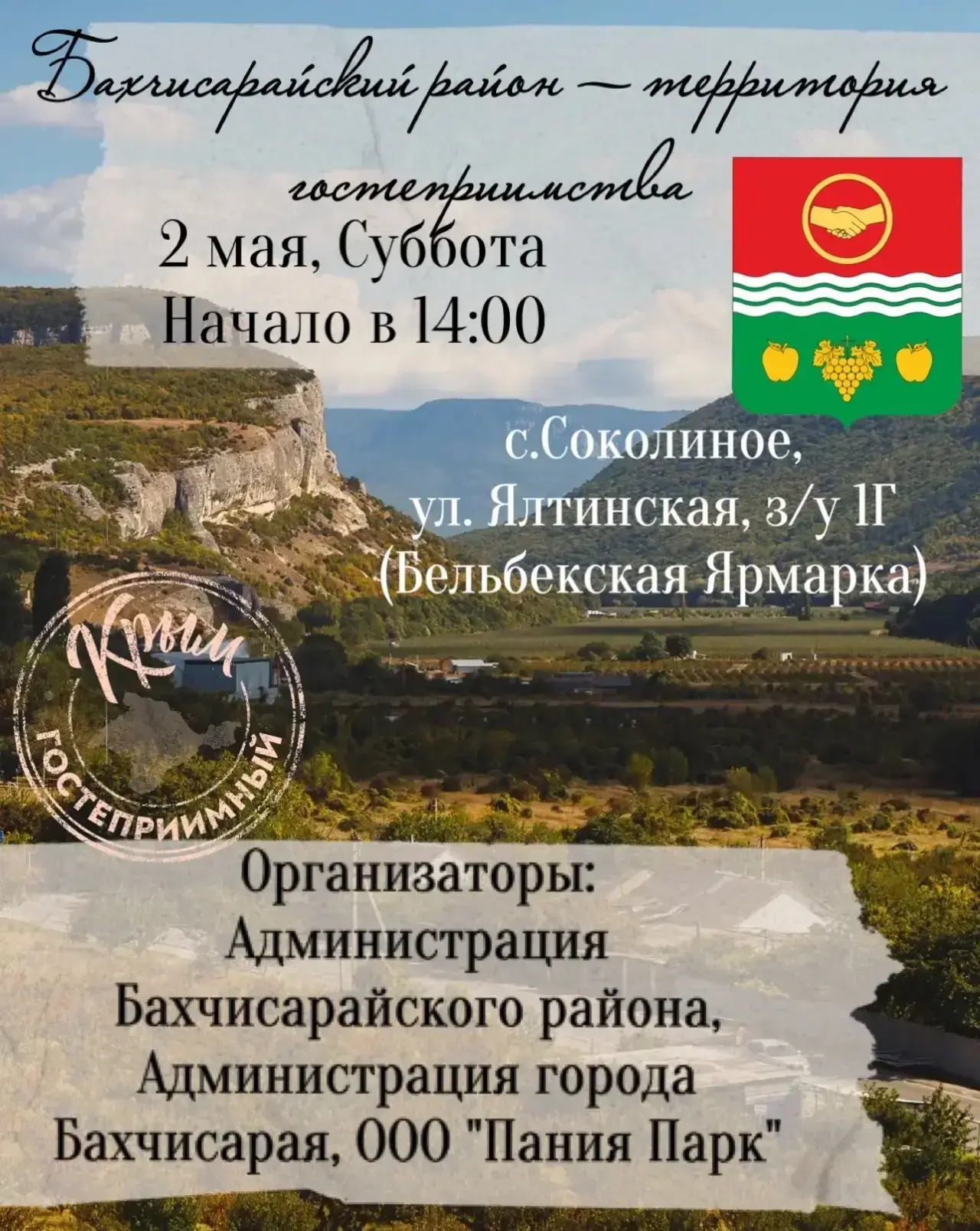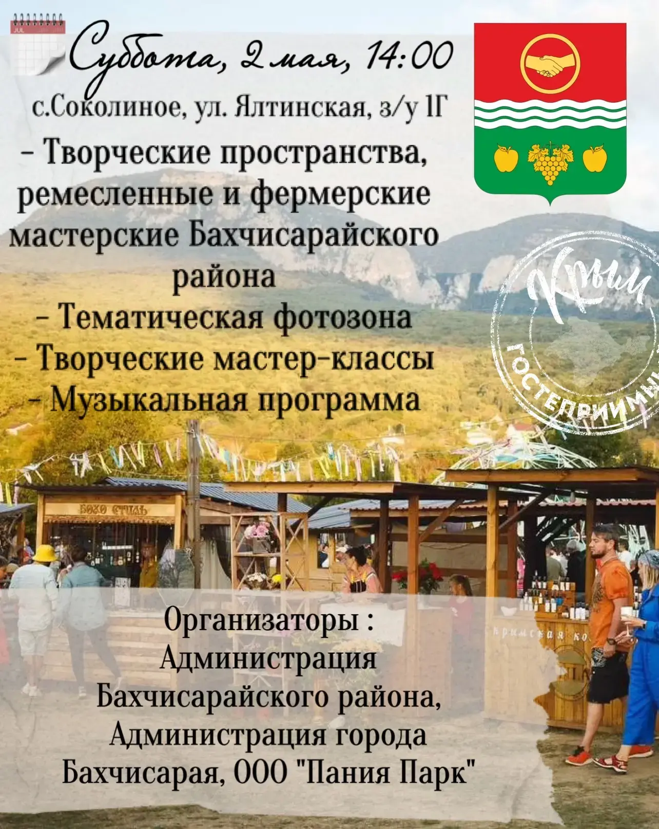 Одним из ключевых мероприятий станет праздник «Бахчисарайский район — территория гостеприимства», который пройдёт 2 мая в 14:00 на территории Бельбекской ярмарки: с.Соколиное, ул.Ялтинская, з/у 1г «Бельбекская ярмарка».