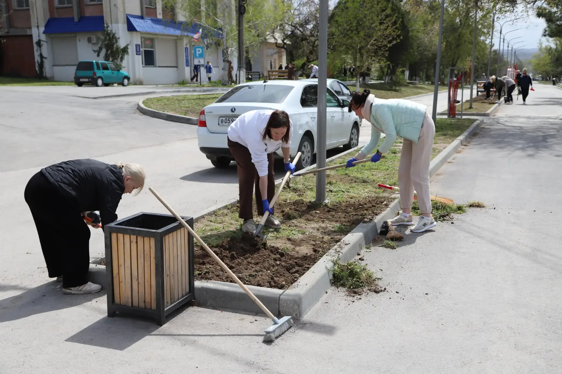 Служащие очистили территорию, прилегающую к административному зданию от бытового мусора и веток, обновили побелку бордюров, пропололи клумбы.
