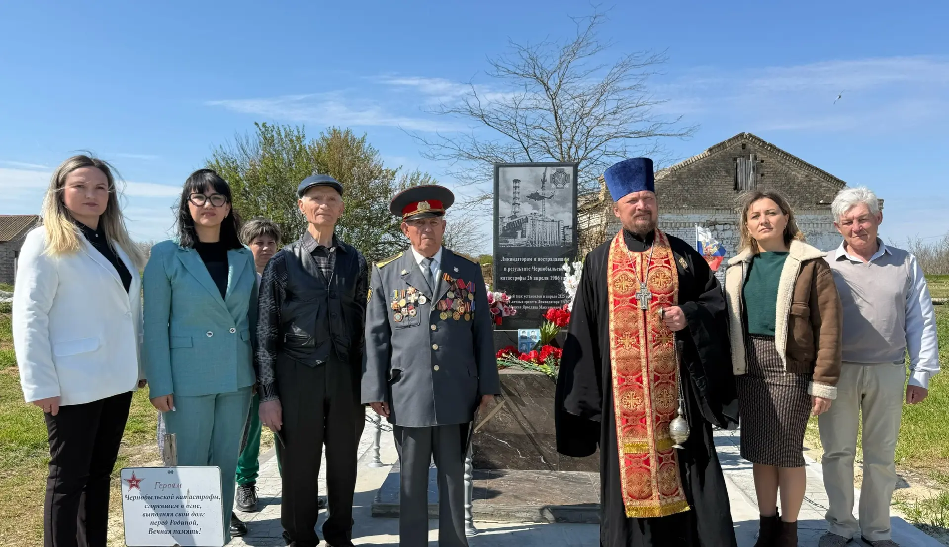 Участники акции возложили цветы к памятному знаку «Ликвидаторам и пострадавшим в результате Чернобыльской катастрофы 26 апреля 1986 года» в с. Краснодольное и почтили память погибших минутой молчания.