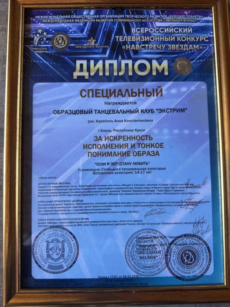 Танцевальный коллектив «Dance School Xtream» привез множество наград с Всероссийского телевизионного конкурса «Навстречу звездам», который прошёл в Симферополе. Команда из 63 танцоров возрастом от 7 до 20 лет набрала наивысшее количество баллов у судейской коллегии и завоевали главный приз — Гран-При.