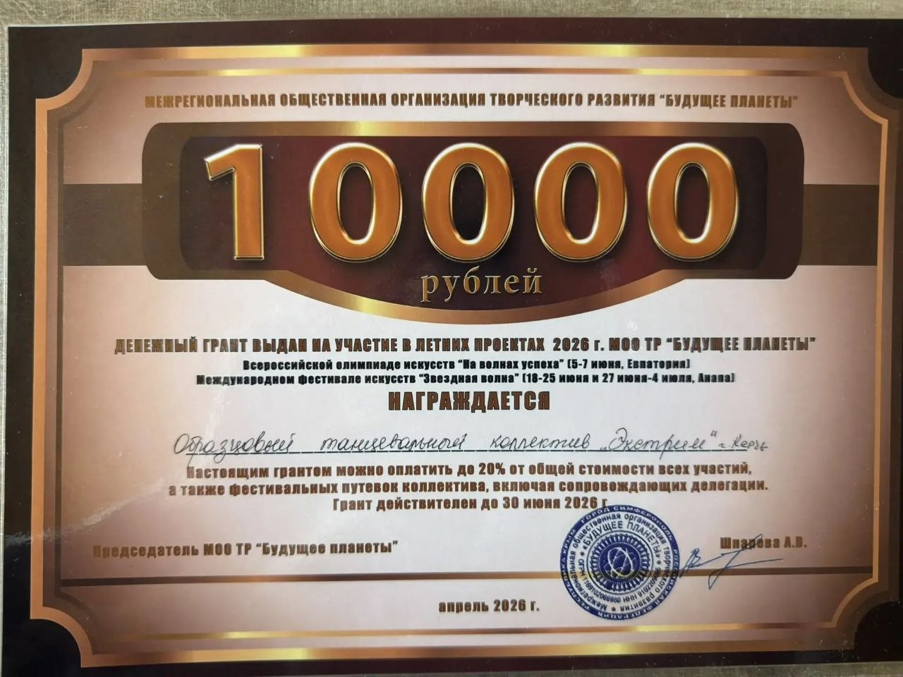 Кроме того, коллектив получил Сертификат участника реестра Общероссийской книги Почёта «Одарённые дети России», а также Специальный диплом и кубок за искренность исполнения и понимание образа. Еще одним особым призом стал грант в размере 10 000 рублей на участие в летних проектах Межрегиональной общественной организации творческого развития «Будущее планеты».